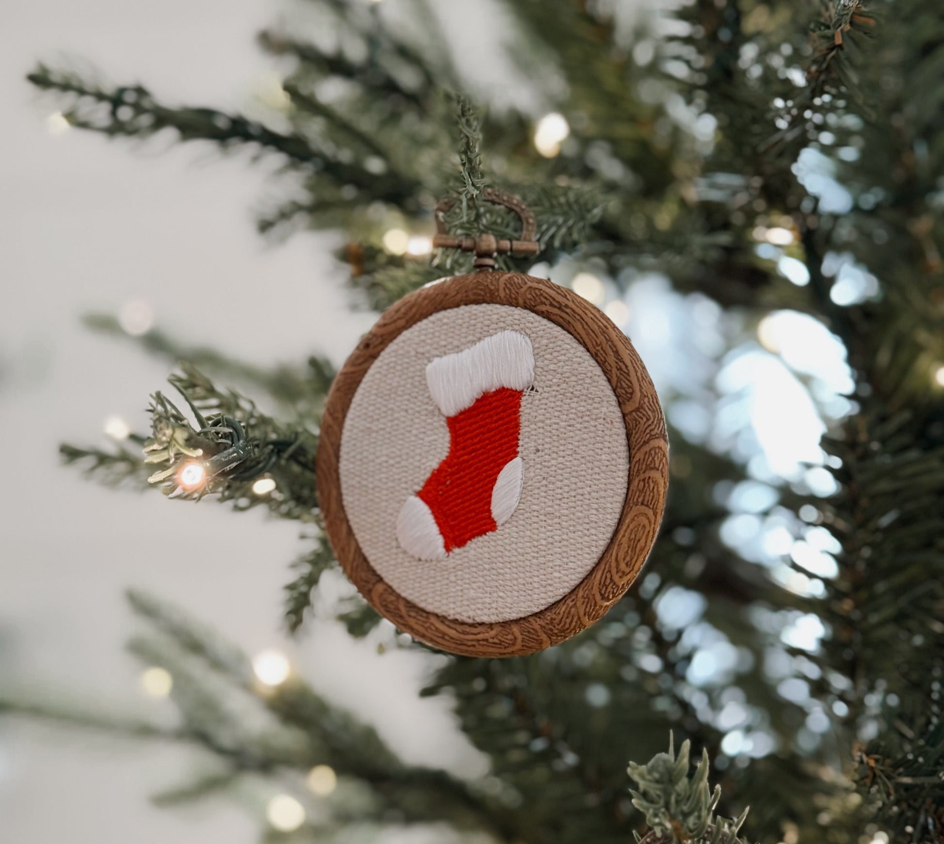 A collaboration with Simply Inspired Design Co brings timeless charm to your tree with this Classic Christmas Embroidery Ornament Set - a crafted trio featuring a candy cane, a christmas stocking, and a cheerful snowman. Each mini embroidery hoop ornament is stitched with care to capture the warmth and nostalgia of a classic Christmas.